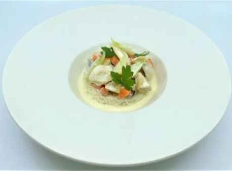 3Confectionner la sauce, mélanger l’eau, le Concentré Liquide Légumes CHEF® et la crème. Porter à ébullition et cuire à frémissement pendant 20 minutes. Ajouter le Roux Blanc CHEF® et cuire de nouveau 3 minutes. Passer la sauce au chinois étamine sur les Emincés Veggie GARDEN GOURMET®.