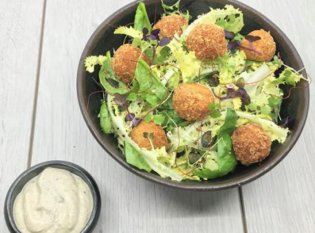 6Servir la salade et les cromesquis chauds accompagnés de la sauce au poivre fermenté.