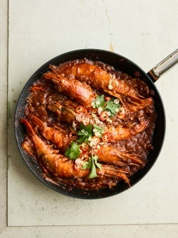8Bien enrober les crustacés avec la sauce tomate pimentée. Saupoudrer de coriandre, de piment et citronnelle hachés. Servir.