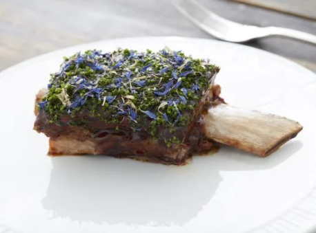 4Remettre en température la pièce de viande, puis la badigeonner avec le laquage et finir avec la ciboulette et les pétales de fleur.