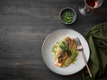 Pavé de saumon en croûte, quinoa blanc, chou Kale croustillant et huile de pesto