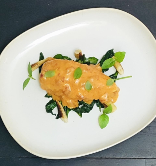 5Dresser dans une assiette une cuillère de pousse d’épinard, ajouter le suprême de volaille et napper généreusement de sauce. Parsemer quelques morceaux de mini maïs et de pousse de basilic. Servir.