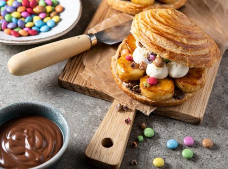 Un burger brioché gourmand à la banane et aux saveurs chocolat noisette.