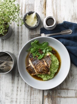 6Dresser le risotto dans des assiettes creuses, disposer ensuite les pavés de poisson, les pois gourmands et verser le bouillon chaud à l'ail noir.